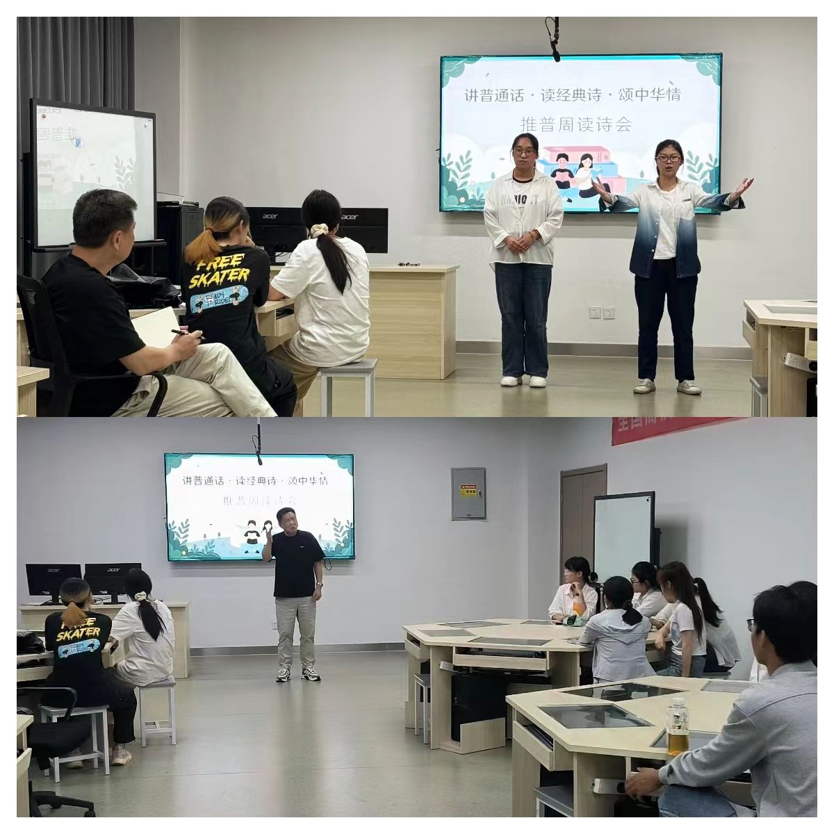 推普周期间,基础部认真贯彻推普工作精神,积极做好宣传工作,分别在文津校区和银湖校区张贴推普周宣传海报,营造浓厚的推普氛围。文津校区开展了推普周趣味活动。通过方言普通话对对碰、说绕口令等小游戏,学生们对普通话的日常使用有了更深刻的认识,感受到语言文字的独特美。银湖校区举办了“讲普通话·读经典诗·颂中华情”推普周读诗会。活动邀请了国家级普通话水平测试员、芜湖市语委办高级讲师李波,与同学们一起读诗。他们用标准流利的普通话深情诵读中华经典诗歌,抑扬顿挫、声情并茂。这不仅是一次语言韵律之美的展示,更是一次心灵的触动和文化的传承。