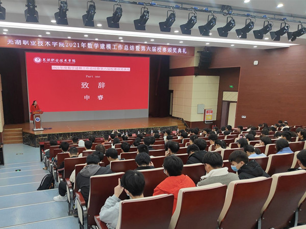 芜湖职业技术学院2021年度数学建模工作总结暨第六届校赛颁奖典礼于12月11日下午在南校区图书馆报告厅隆重举行。基础教学部副主任申睿、数学建模教练组部分成员、第六届数学建模校赛获奖学生代表共100余人参加了活动。