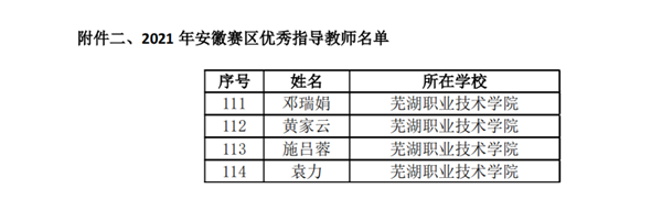 近日,全国大学生数学建模安徽赛区组委会公布了2021年度的优秀组织奖和优秀指导教师名单。我校被授予优秀组织奖,黄家云、袁力、邓瑞娟、施吕蓉四位老师被授予优秀指导教师。我校是获得优秀组织奖仅有的两所高职院校之一,也是获得优秀教师人数最多的高职院校。