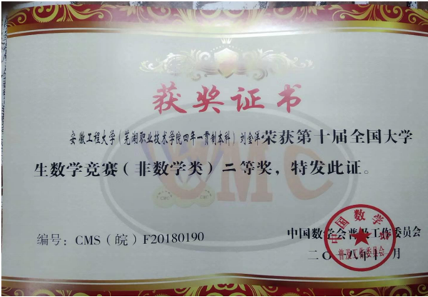 在基础部老师们指导带领下,2017年获得全国大学生数学竞赛三等奖,2018年获得全国大学生数学竞赛二等奖,2019年获得全国大学生数学竞赛一等奖。在基础部刘有新教授的指导下荣获得第十四届芜湖数学建模联赛团体三等奖,在基础部刘有新、李艳午、孔生林、邓瑞娟等数学老师的指导下多次参加数学竞赛并获奖。在2020年全国硕士研究生招生考试中,凭借多次参加数学竞赛的经历,在考试中发挥出色,在研究生复试中,数学竞赛的经历使得我成功地以高分被合肥工业大学录取!